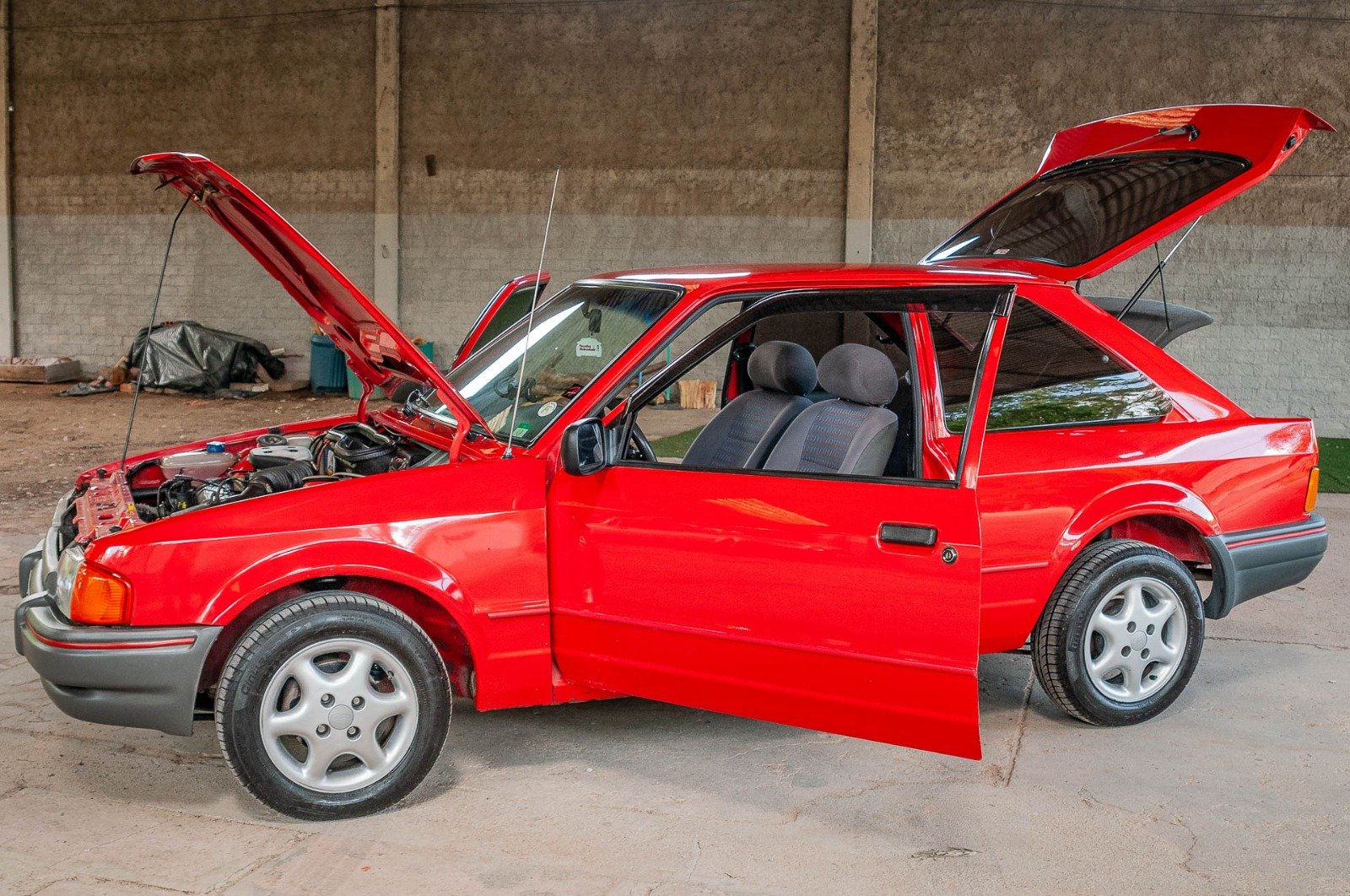O Escort Hobby era a versão de entrada. Mas este aqui anunciado conta com o pacote mais completo de opcionais que era possível incluir. Estão aqui ar quente, limpador e desembaçador traseiro, espelho retrovisor direiro e ainda o relógio digital no teto. Raro e bastante cultuado pelos entusiastas. Como acessório, estão instalados os vidros elétricos.